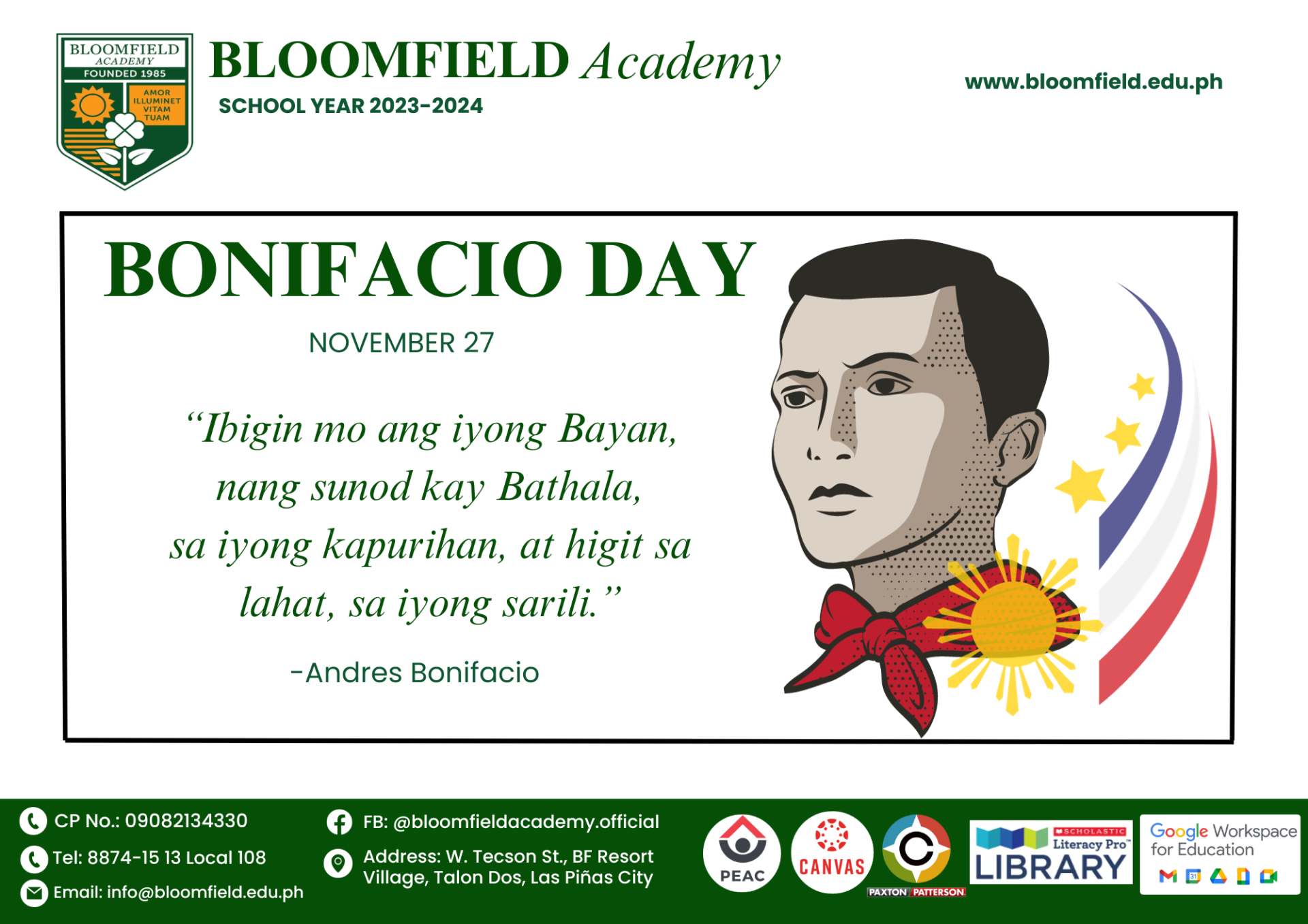 Uncategorized Bonifacio Day Date November 27, 2023 Reading Time < 1 Min Read Born on November 30, 1863, in Tondo, Manila, Andrés Bonifacio, one of our national heroes,...