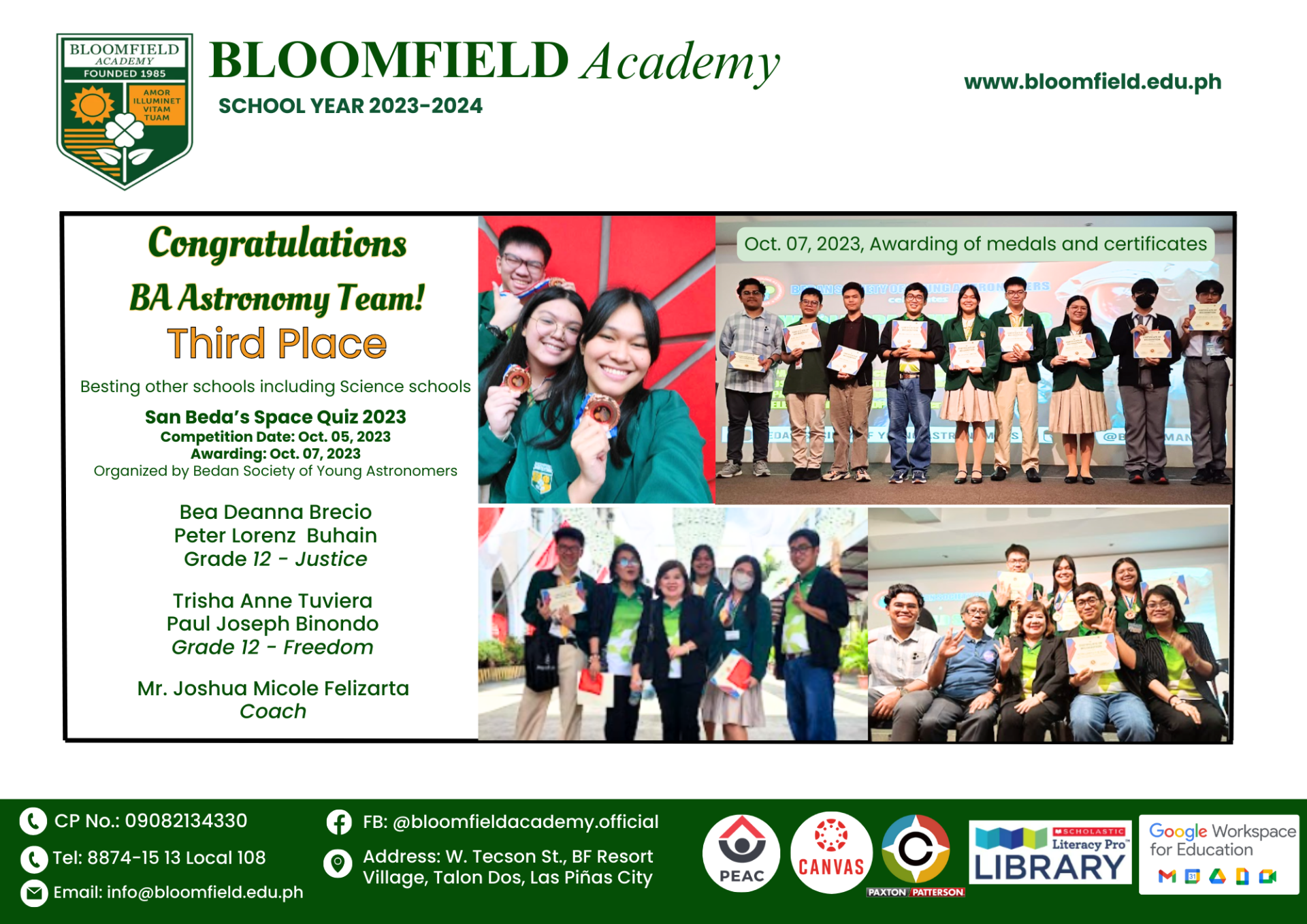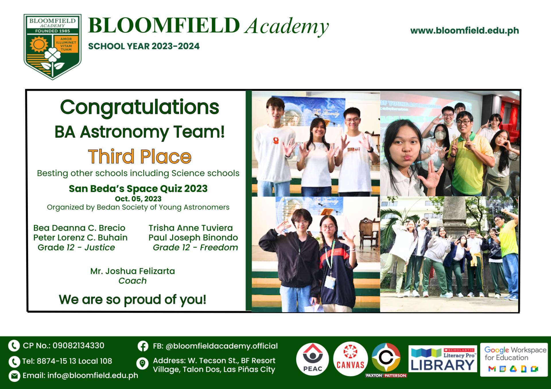 Uncategorized Space Quiz 2023 Date October 6, 2023 Reading Time < 1 Min Read We are thrilled to extend our heartfelt congratulations to the exceptional members of the Bloomfield...
