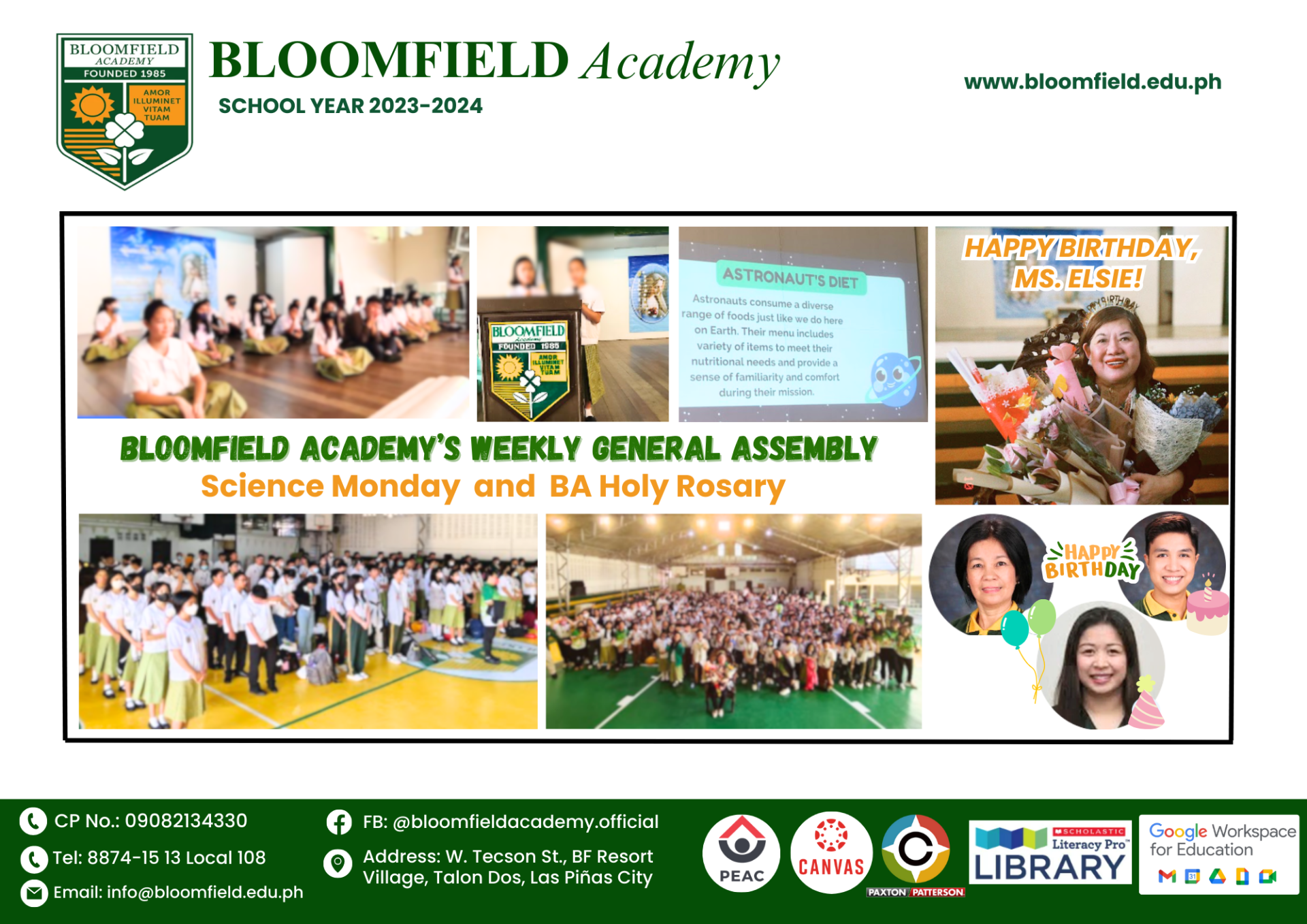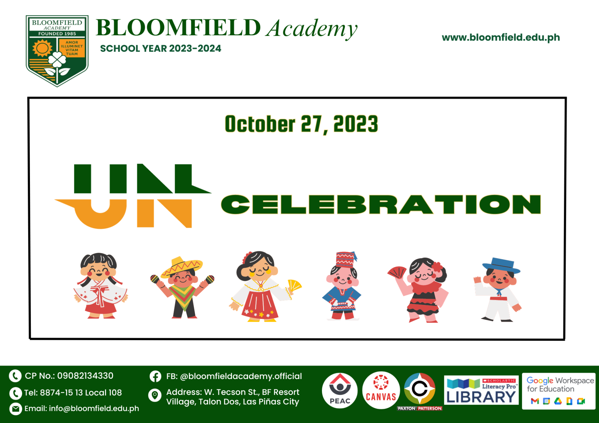 Your search result: All clubs (5) parent testimonials (5) Uncategorized (147) Uncategorized UN Celeb Date October 25, 2023 Reading Time < 1 Min Read The United Nations Day is celebrated every October to commemorate the anniversary of the official... Uncategorized CEAP 2023 Convention Date October 20, 2023 Reading Time < 1 Min Read Bloomfield Academy representatives attend the CEAP 2023 Convention, Oct.17-20, 2023, at Waterfront Hotel,Cebu. This event,... Uncategorized Student-Teacher Takeover Date October 19, 2023 Reading Time < 1 Min Read On Oct 20, chosen BA students, under the mentorship of their teachers, will temporarily take... Uncategorized Moon Night Date October 11, 2023 Reading Time < 1 Min Read We would like to invite you, Bloomfieldians, to our International Observe the Moon Night 2023,... Uncategorized Space Quiz Awarding Oct 7th Date October 10, 2023 Reading Time < 1 Min Read The first of many awards this school year! Once again, a big congratulations to the outstanding... Uncategorized Monday Highlights: October 9, 2023 Date October 9, 2023 Reading Time < 1 Min Read Our week kicked off with a blend of solemnity, fun learning moments, and warm greetings.1.... Uncategorized Space Quiz 2023 Date October 6, 2023 Reading Time < 1 Min Read We are thrilled to extend our heartfelt congratulations to the exceptional members of the Bloomfield... 1 … 17 18 19 20 21